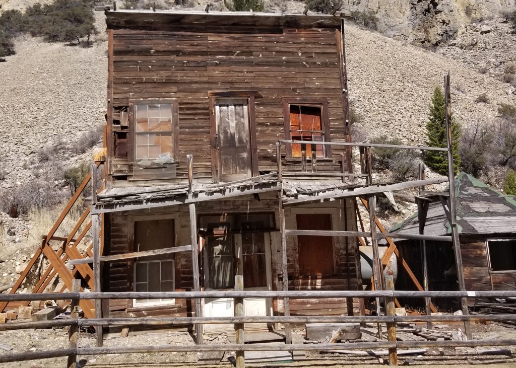 Although in poor condition, this building at Bayhorse State Park is immediately recognizable for what it was as a boomtown hotel building, identifiable by the false-front design and the exterior door on the second story. Siding and windows, while in a state of disrepair, are all original materials and accurately convey the building’s era as late 19th century. This building is listed in the NRHP.