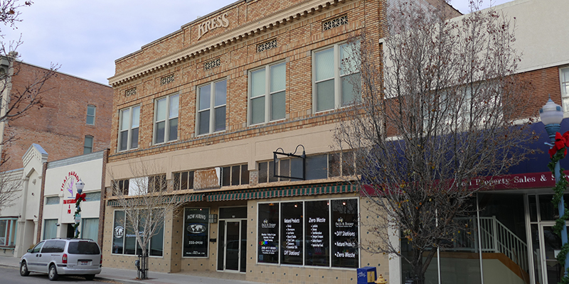 Built prior to 1927, the two-story, tan brick building was constructed to house the S.H. Kress & Co department store, which was part of a chain of five and dime retail stores established by Samuel Henry Kress in 1896. In an attempt to distinguish his stores from those of his competitors, he created an architectural division within his company to design distinctive buildings. Located on Main Street in downtown Pocatello, this Kress building still boasts its attic-story “Kress” nameplate.